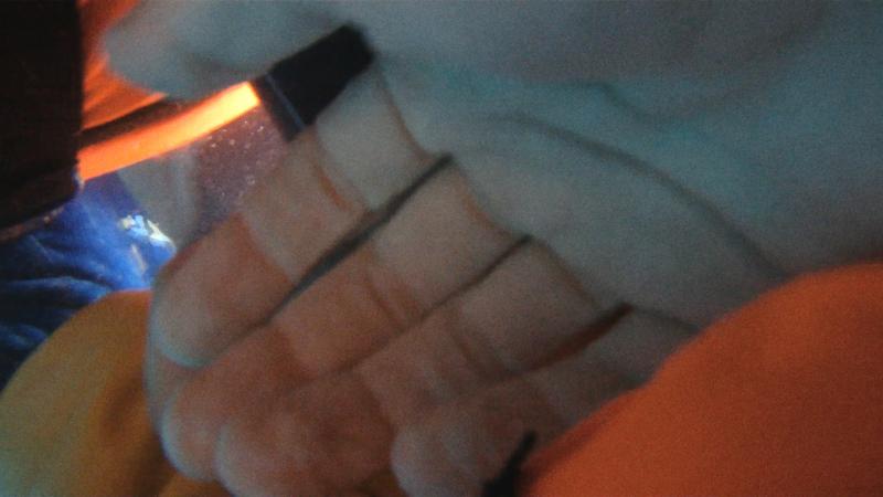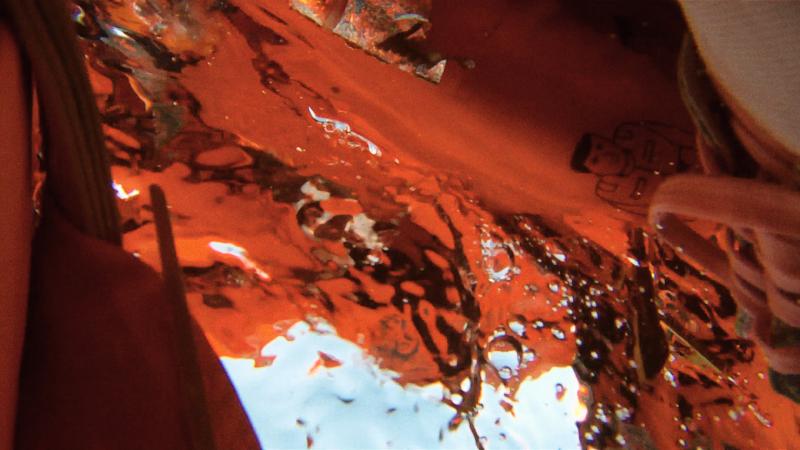 „Ich sehe alles,“ sagt sie. Es klingt wie ein Fluch. Sonnenschein, strahlend blauer Himmel. Das Meer ruhig, gerahmt von einem Stück Reling. Diffuses Stimmengewirr. Ein friedlicher Moment, stünde das Meer nicht vertikal wie ein Wasserfall. Bilder reißen vorbei, kreisend, kopfüber, ruckhaft. Menschen im Boot, im Wasser, Schreie, Schwimmwesten, Signalpfeifen. Leuchtendes Orange, in dem sich die Sonnenstrahlen in geometrische Figuren brechen. Kein Horizont mehr, kein Himmel, kein oben und unten, nur Tiefe und kein Halt. Auch die Zeit folgt keiner Richtung, sie zieht sich zusammen zu einem brutalen Jetzt. Sie filmt und spricht. Zu ihrem Mann, zu sich selbst, vielleicht zu uns. Schwebende Beine in Jogginghosen, in Jeans, eng aneinandergedrängt. Eine Bluse mit Schmetterlingen, die Flügel scheinen im Wasser zu schlagen. Der schlangenähnliche Gürtel eines Mantels, ein zerknickter Plastikbecher, eine Schachtel Zigaretten. Fuck you all! Sie spricht, wütet und filmt gegen die Müdigkeit an, gegen die Kälte, gegen die ausbleibende Hilfe. Gegen das Sterben, damit irgendwas bleibt.